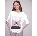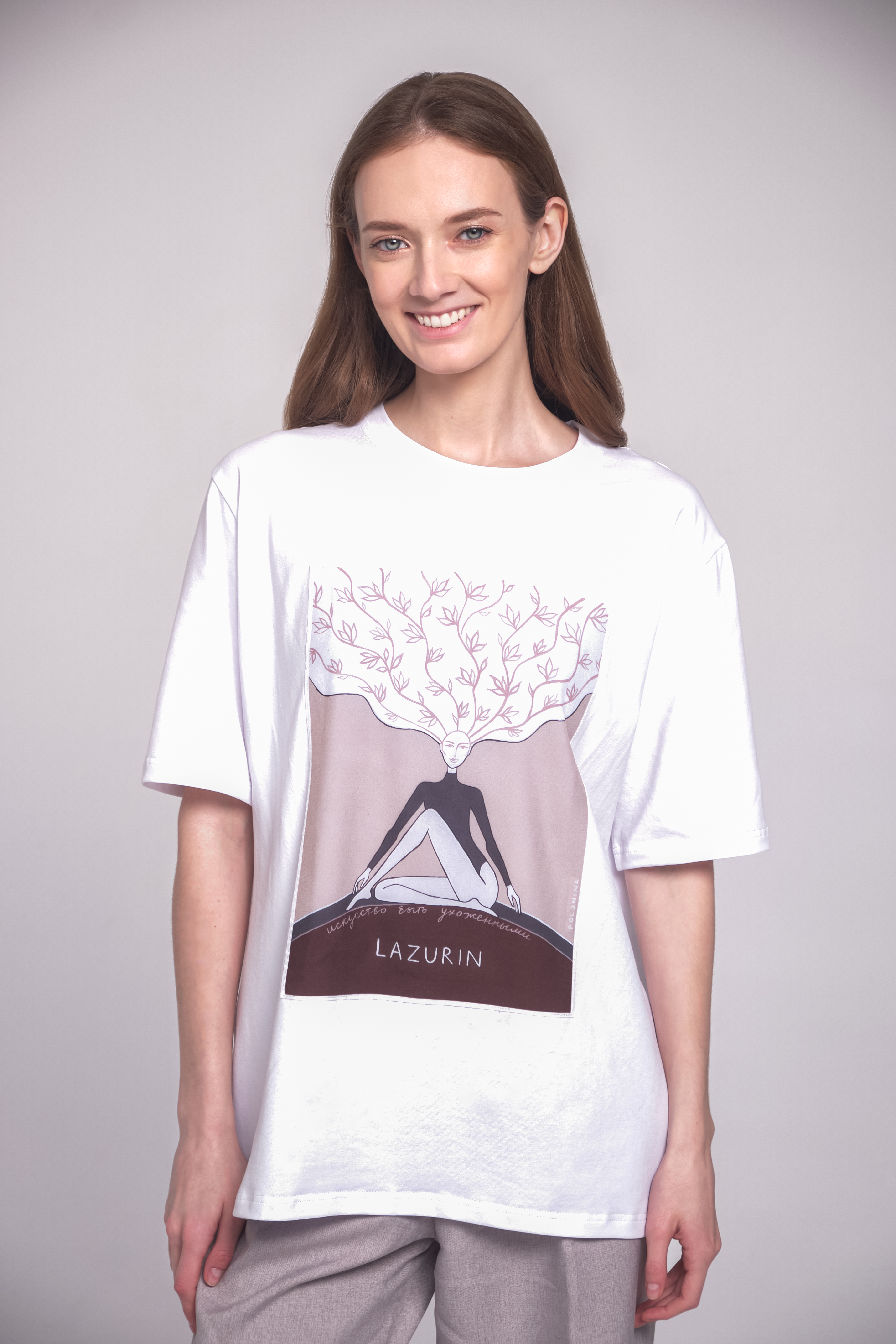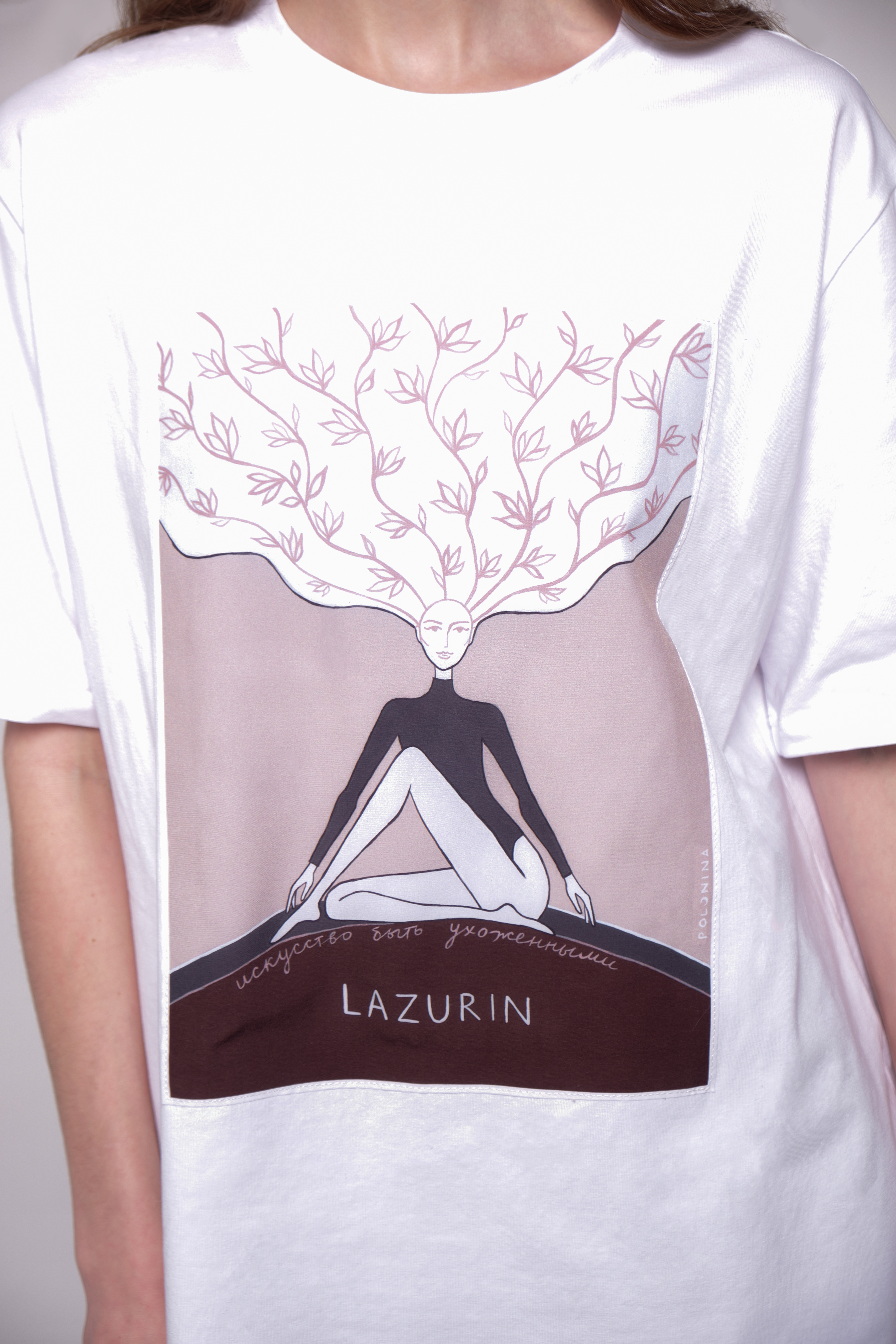 Фирменная футболка от бренда LAZURIN разработанная совместно с фэшн дизайнером Настей Полуниной. Посыл, который заложен в данном принте: "На принте изображена Муза, которая заботиться о себе и использует синергию с природой и природной женской силой. Акцент сделан на волосах как одном из якорных символов красоты и природности. Муза сидит устойчиво на земле, что олицетворяет ее связь с Матерью природой и ее внутреннюю силу". Принт напечатан на искусственном шелке и пришит к изделию. Футболка изготовлена из мягкого и плотного хлопка.